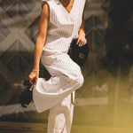 Completo da ufficio in due pezzi con pantaloni senza maniche e scollo a V con stampa bianca