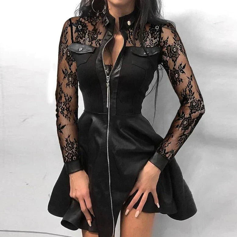 Abito da donna - Aderente con pizzo - Maniche lunghe trasparenti - Chiusura con cerniera