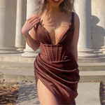 Abito da sera da donna - Scollatura profonda - Corsetto strutturato - Elegante spacco. Lasciati conquistare da questo splendido abito da sera. Caratterizzato da una profonda scollatura, un corpetto strutturato a corsetto e un elegante spacco, questo abito è perfetto per ogni occasione speciale. L'elegante tessuto effetto raso garantisce una sensazione di lusso.