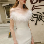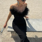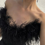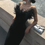 Abito lungo da festa aderente senza spalline con scollo a V e bordo sfrangiato