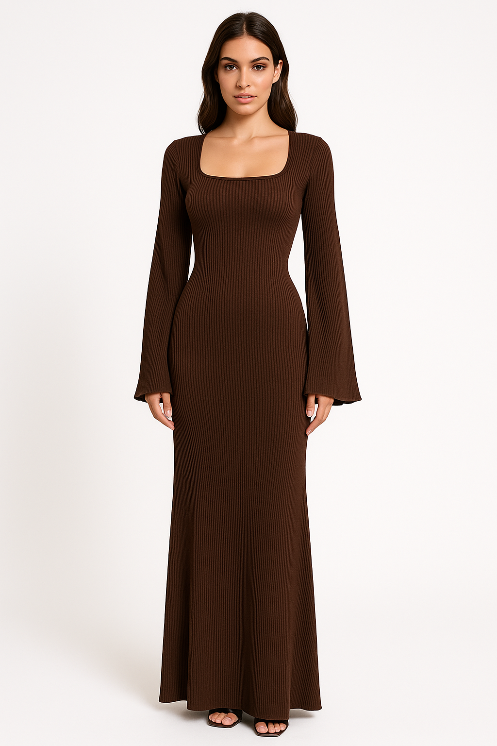 Abito da donna a maniche lunghe – Maglia a coste – Taglio a sirena – Scollo quadrato