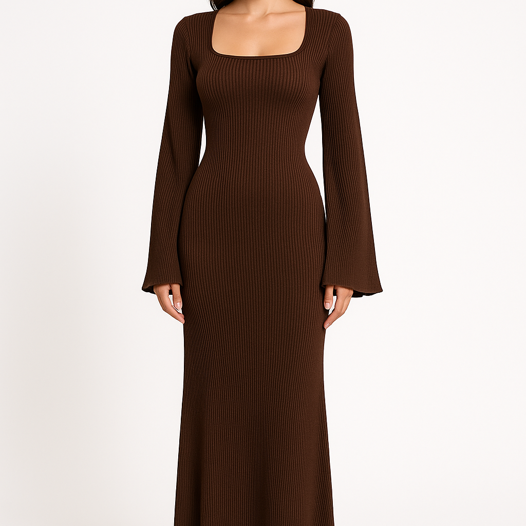 Abito da donna a maniche lunghe – Maglia a coste – Taglio a sirena – Scollo quadrato