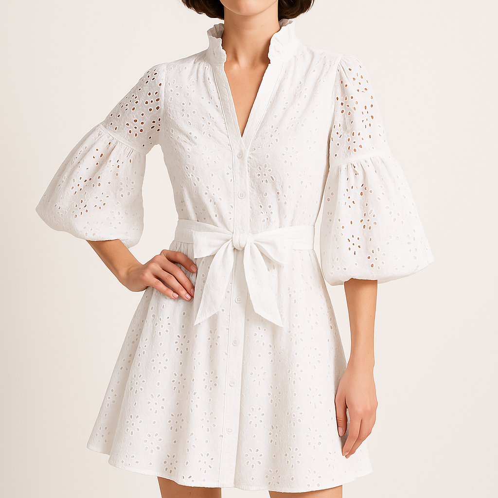 Abito da donna – Cotone leggero – Taglio a trapezio – Ricamo a occhielli – Maniche a sbuffo
