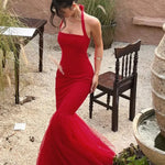 Abito lungo a coda di pesce con scollo all'americana e giunture