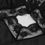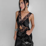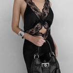 Abito lungo aderente a sirena con scollo a V e volant in pizzo