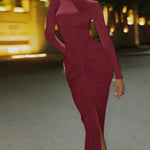 Abito lungo aderente con spacco e collo alto sottile