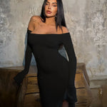Abito lungo elegante aderente con spalle scoperte e lacci