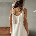 Abito lungo in lino color cachi con scollo rotondo e volant