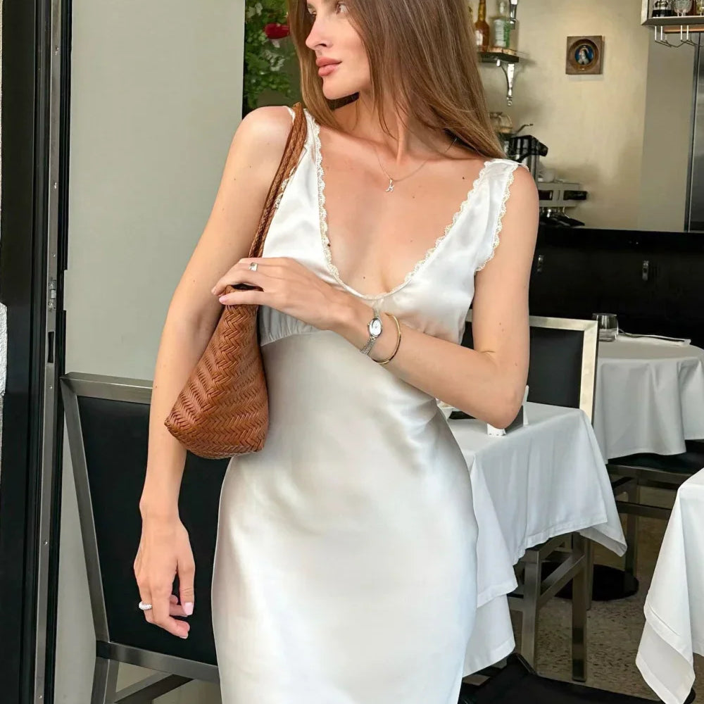 Abito lungo elegante con canotta bianca e bordi in pizzo