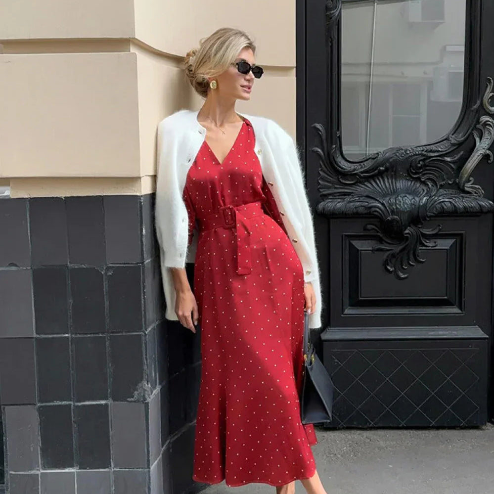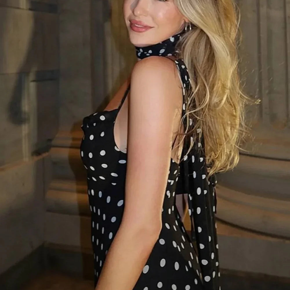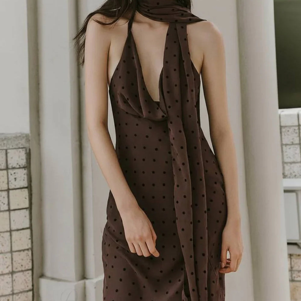 Abito lungo a pois con cintura in vita e schiena scoperta