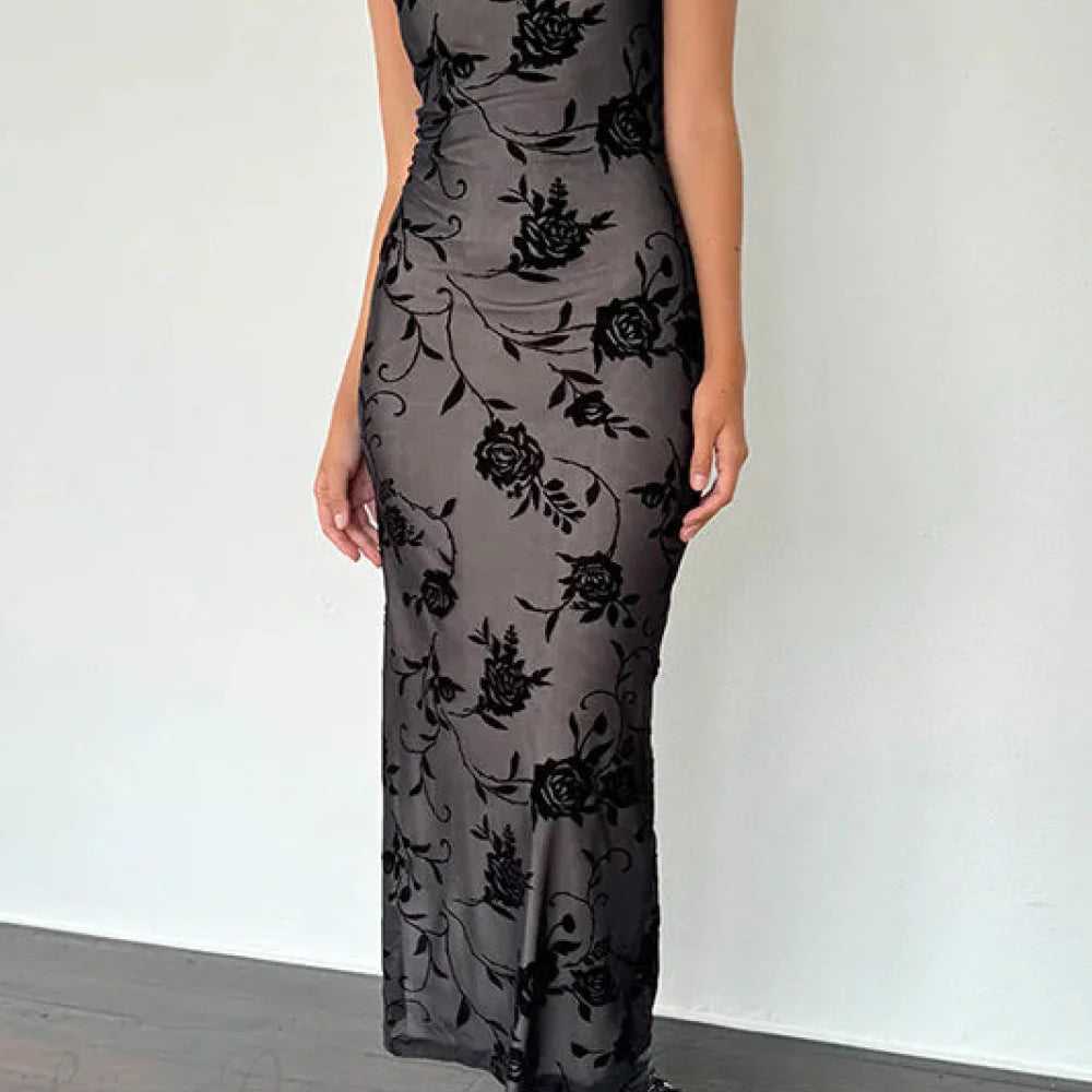 Abito lungo aderente senza maniche in rete floccata