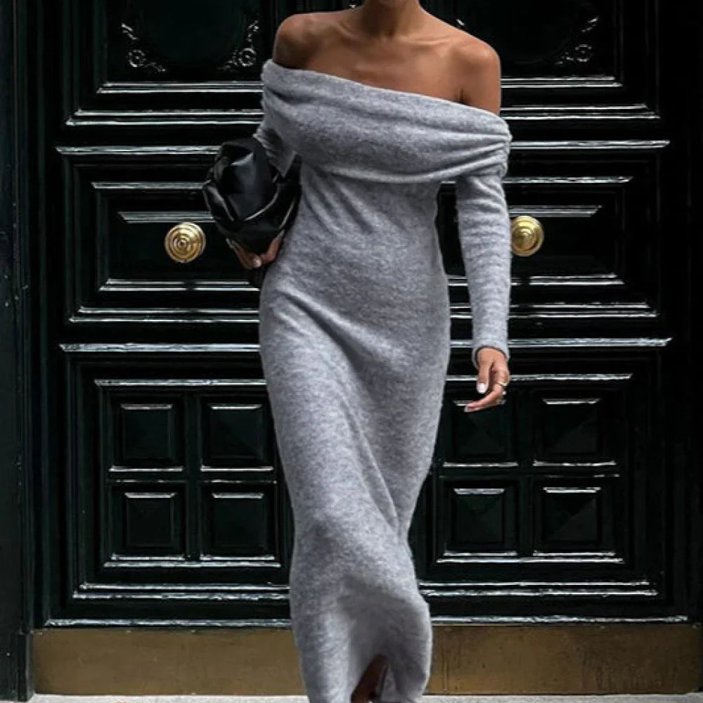 Abito lungo aderente in maglia con spalle scoperte e maniche lunghe