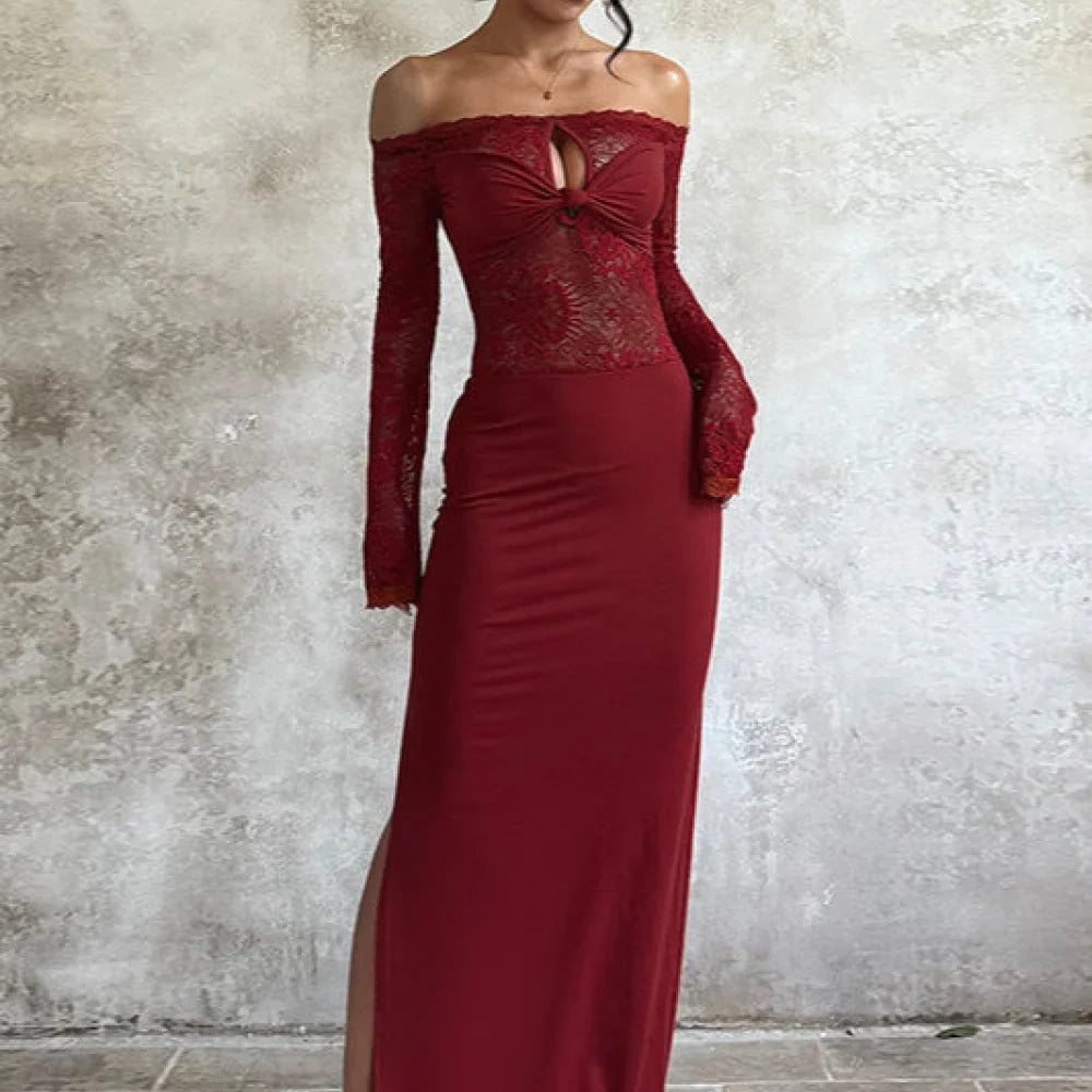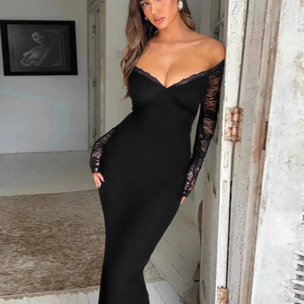 Abito lungo aderente elegante in pizzo con spalle scoperte