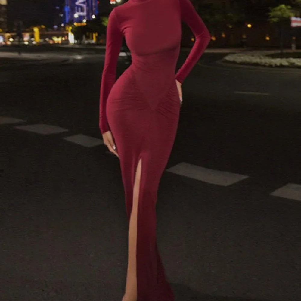 Abito lungo aderente con spacco e collo alto sottile