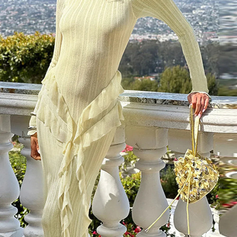 Abito lungo aderente con volant e nodo