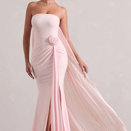 Abito lungo senza maniche con stampa floreale 3D e spalle scoperte