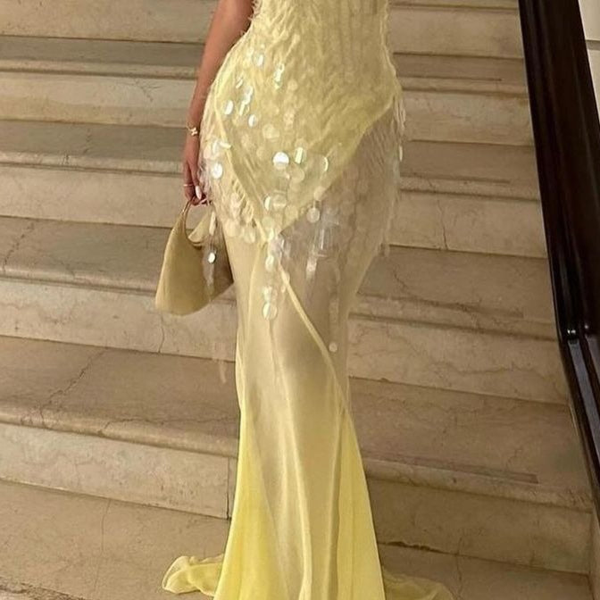 Abito lungo a sirena con scollo a V e spalline incrociate in paillettes