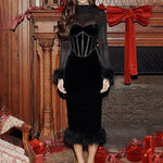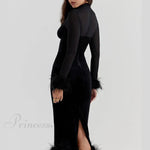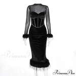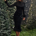 Abito midi da donna con vita alta, aderente, retrò, in rete con piume e cuciture