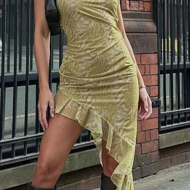 Abito monospalla con orlo irregolare e volant stampato