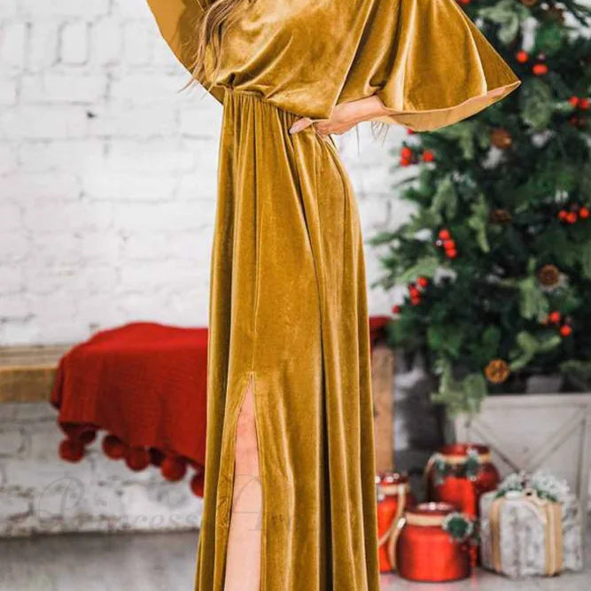 Abito midi in velluto con scollo rotondo e spacco alto