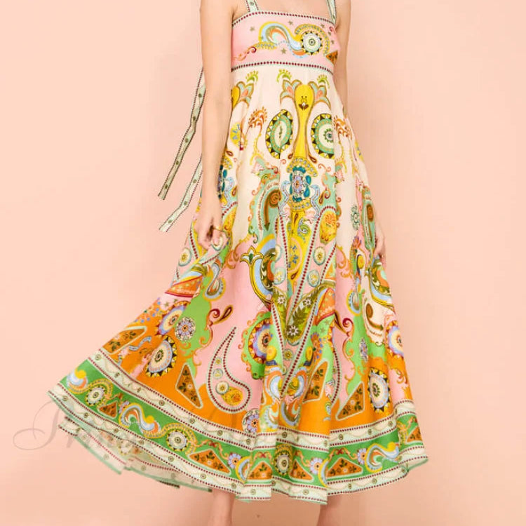 Abito midi con spalline sottili e grazioso motivo floreale bosniaco