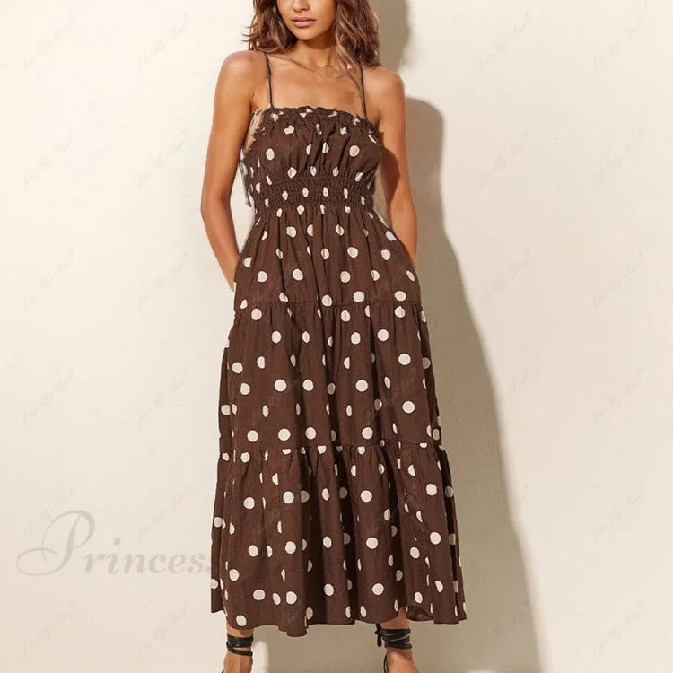 Abito con elastico plissettato e stampa trendy a pois color cioccolato e avorio
