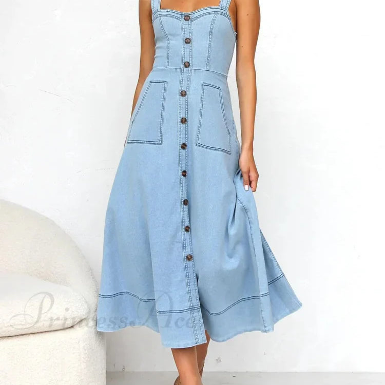Abito midi casual con bottoni e bretelle in denim