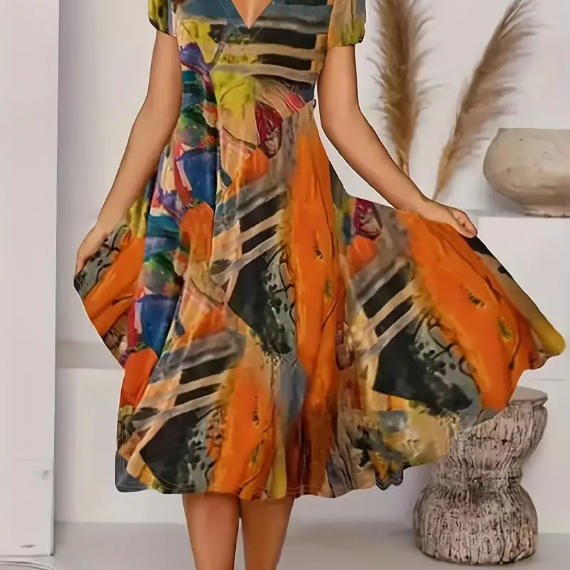 Abito da donna - Taglio a trapezio - Elegante scollo a V - Maniche corte - Motivo astratto