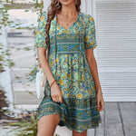 Ogni abito presenta un lusinghiero scollo a V, maniche corte leggermente a sbuffo e una vita impero rilassata che si fonde con una giocosa gonna al ginocchio. Decorati con motivi floreali e intricati, questi abiti emanano un senso di giocosa raffinatezza, rendendoli un'aggiunta versatile al tuo guardaroba.