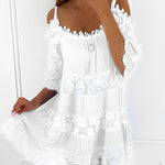 Realizzato in un tessuto leggero che accarezza delicatamente la pelle, questo abito presenta incantevoli dettagli in pizzo, volant a strati e un orlo fluido. Il design a spalle scoperte con spalline sottili regolabili consente una vestibilità personalizzata, aggiungendo un tocco moderno alla tradizionale silhouette in pizzo.