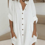 Vi presentiamo il nostro abito bianco con bottoni, dove lo stile senza tempo incontra il comfort senza sforzo. Pensato per la donna moderna che abbraccia la semplicità con un tocco di raffinatezza, questo abito è il perfetto mix di casual ed elegante.