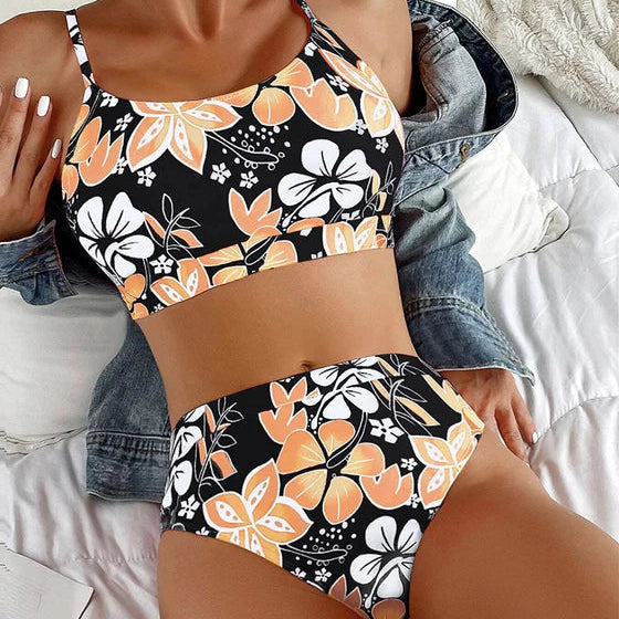 Bikini da donna – Vita alta – Scollatura profonda – Stampa floreale vivace