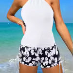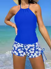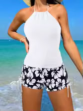 Costume da bagno tankini da donna – Schiena scoperta – Shorts con laccetti floreali – Tessuto traspirante: eleganza e comfort per l'estate. Questo tankini presenta un design con scollo all'americana e pratici pantaloncini floreali, realizzati in tessuto traspirante per una giornata perfetta in spiaggia o in piscina.