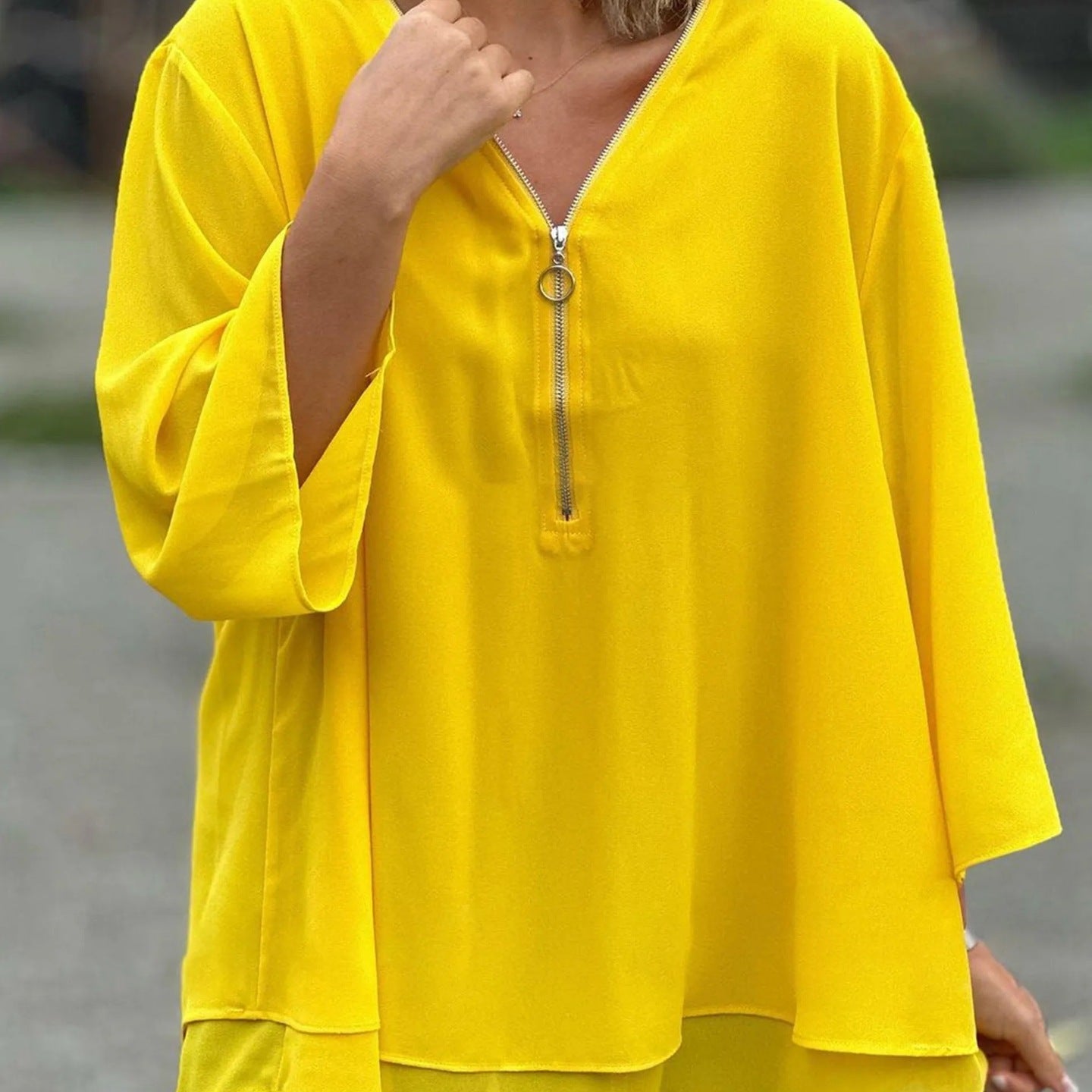 Camicetta da donna – Scollo a V con cerniera – Vestibilità comoda – Maniche a 3/4 – Tessuto leggero e fluido