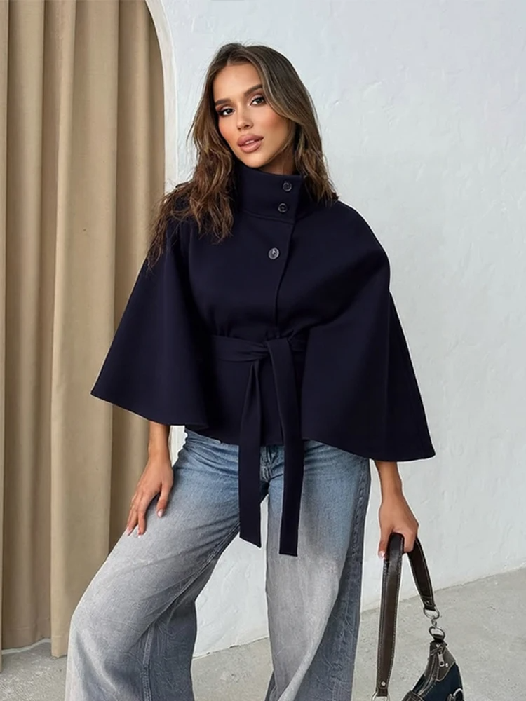 Cappotto a mantella da donna – Lana – Collo alto – Cintura in vita – Taglio fluido