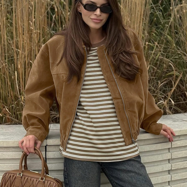 Giacca rilassata in pelle scamosciata vintage con cerniera frontale