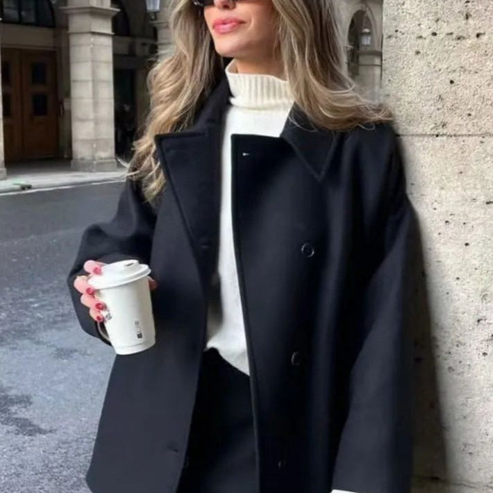 Elegante soprabito nero con scollo a V e maniche a sbuffo