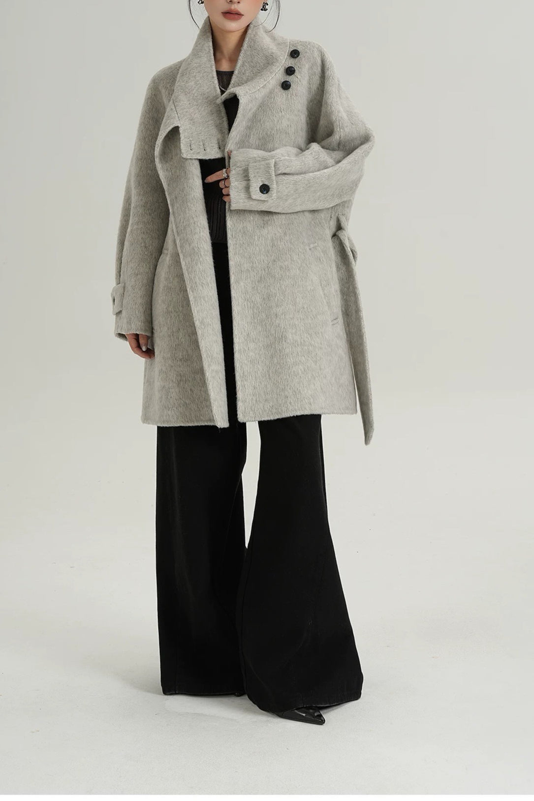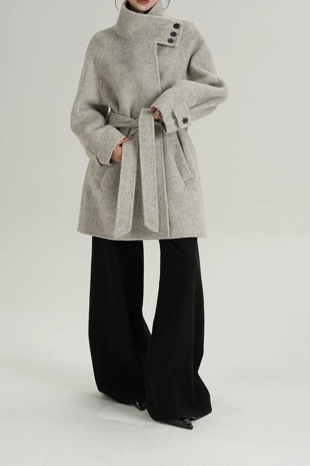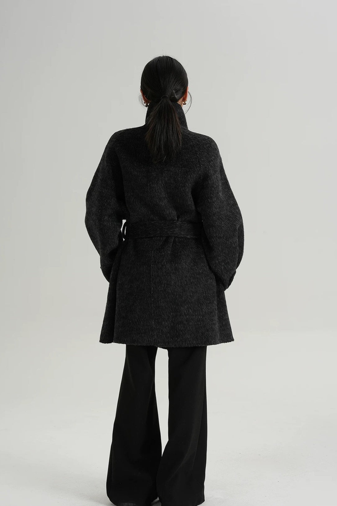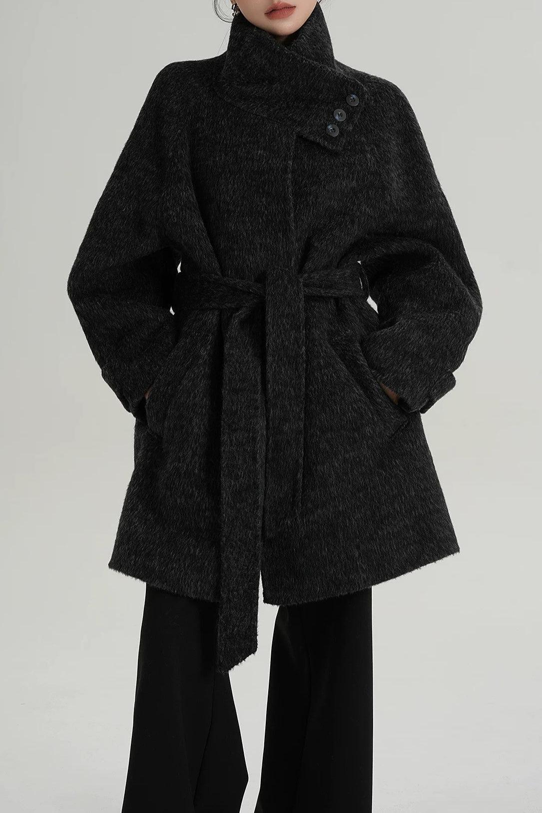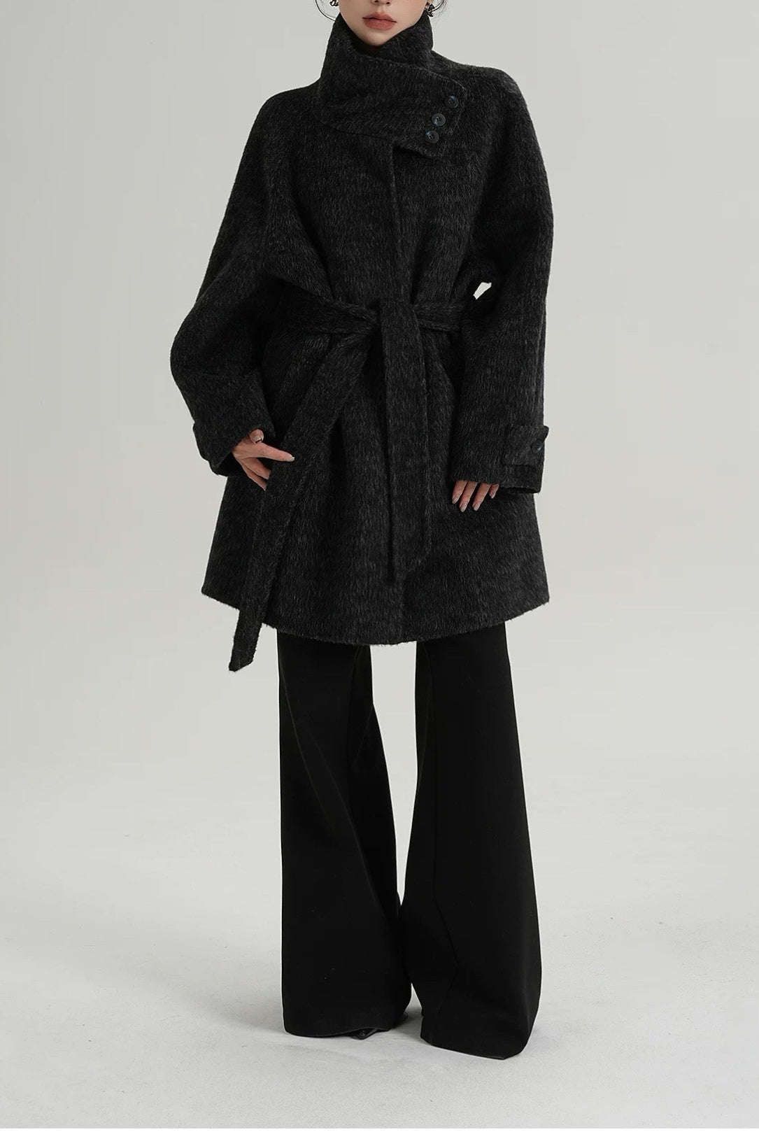 Cappotto a collo alto in lana calda e ampia, elegante e solido