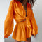 Completo da donna in due pezzi: camicetta a maniche lunghe con laccetti al collo, pantaloncini con balze elastiche in vita