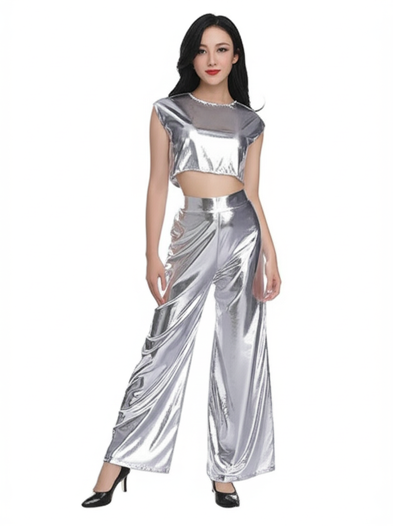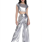Completo composto da top corto metallizzato e pantaloni a gamba larga per donna