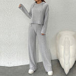 Set da salotto con cappuccio in maglia a coste. Scopri il massimo comfort con questo set da donna con cappuccio in maglia a coste. La vestibilità comoda e i pantaloni a gamba larga offrono uno stile casual ma chic, perfetto per i tuoi momenti di relax.