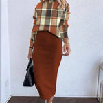 Completo due pezzi da donna – Maglia elasticizzata – Top a maniche lunghe – Gonna midi aderente