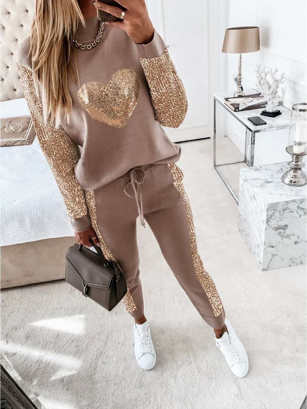 Completo due pezzi da donna - Tessuto in maglia morbida - Vestibilità comoda - Scollo a barca