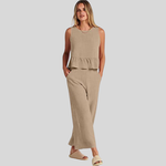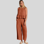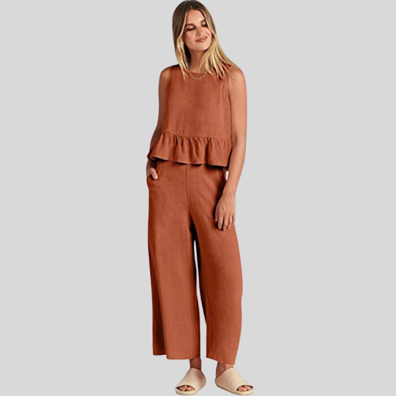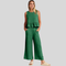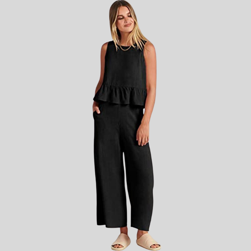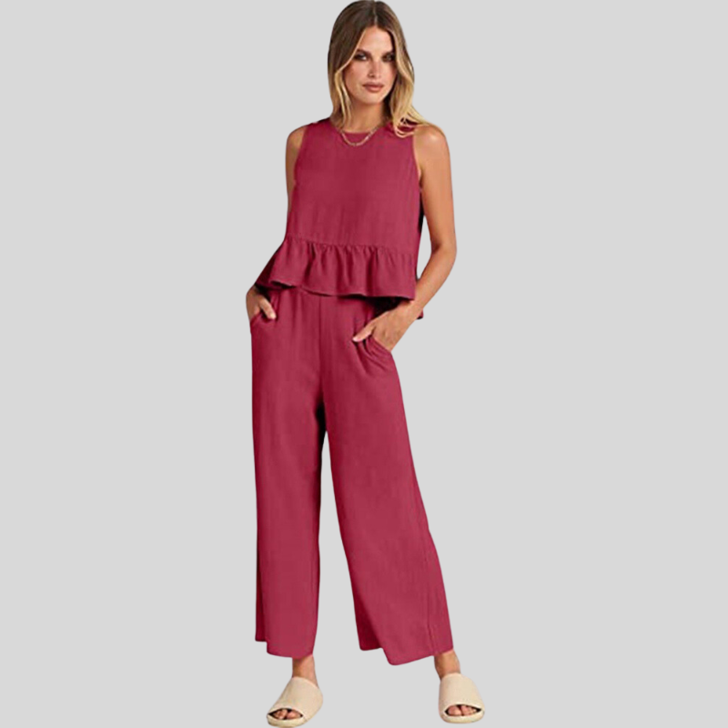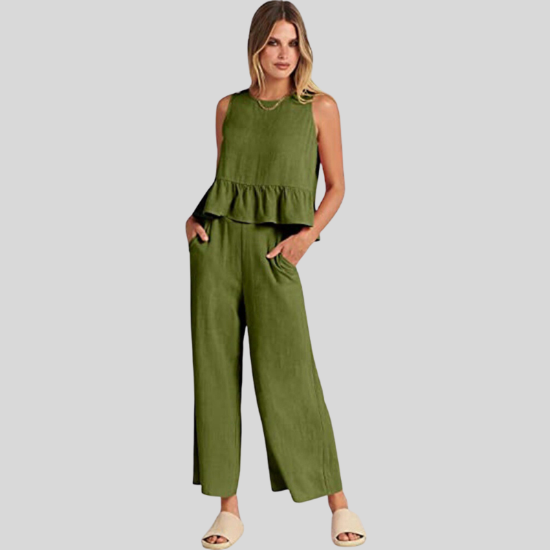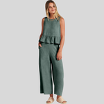 Abbraccia uno stile disinvolto con la nostra tuta senza maniche Emerald Breeze. Un'armoniosa combinazione di comfort ed eleganza, questa tuta presenta un elegante top senza maniche con un delicato volant a peplo che si fonde perfettamente con pantaloni a gamba larga per una silhouette lusinghiera.