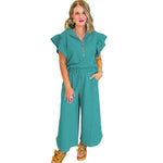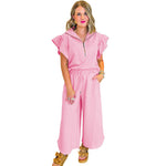 Completo casual da donna – Top con collo a volant e cerniera – Pantaloni larghi con coulisse