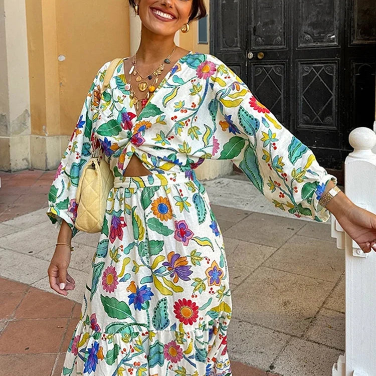 Completo gonna e top da donna - Stile avvolgente - Maniche lunghe - Stampa floreale - Fluido