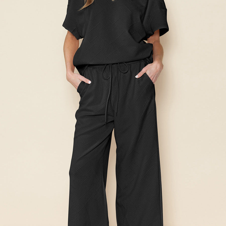 Completo due pezzi da donna – Maglia a coste – Maglia a maniche corte – Pantaloni a gamba larga