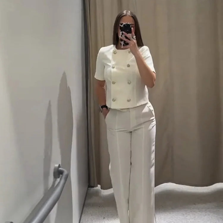 Completo da donna – Giacca corta con bottoni a maniche corte – Pantaloni sartoriali a gamba larga