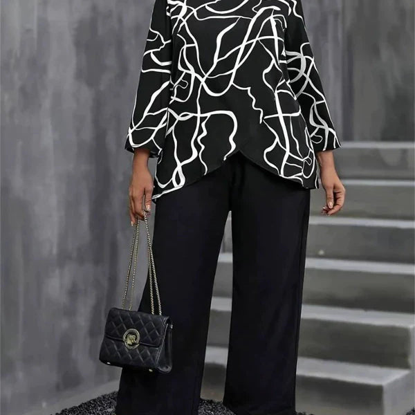 Completo da donna in due pezzi – Top stampato a maniche lunghe e ampio – Pantaloni larghi e fluidi