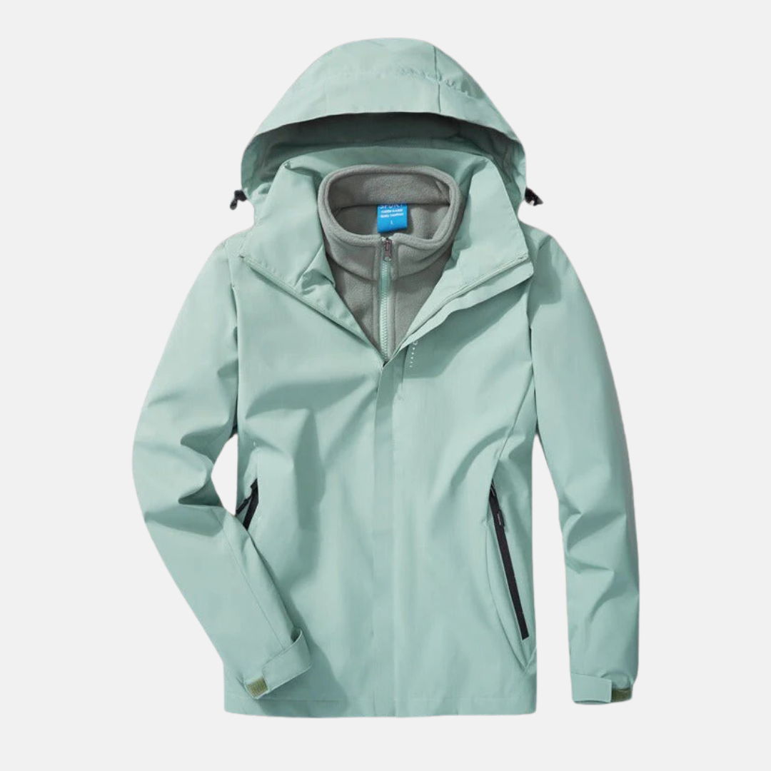 Questo completo da donna in due pezzi, composto da una giacca esterna in tessuto resistente e una fodera in pile, offre una vestibilità comoda e un collo alto con cappuccio regolabile.